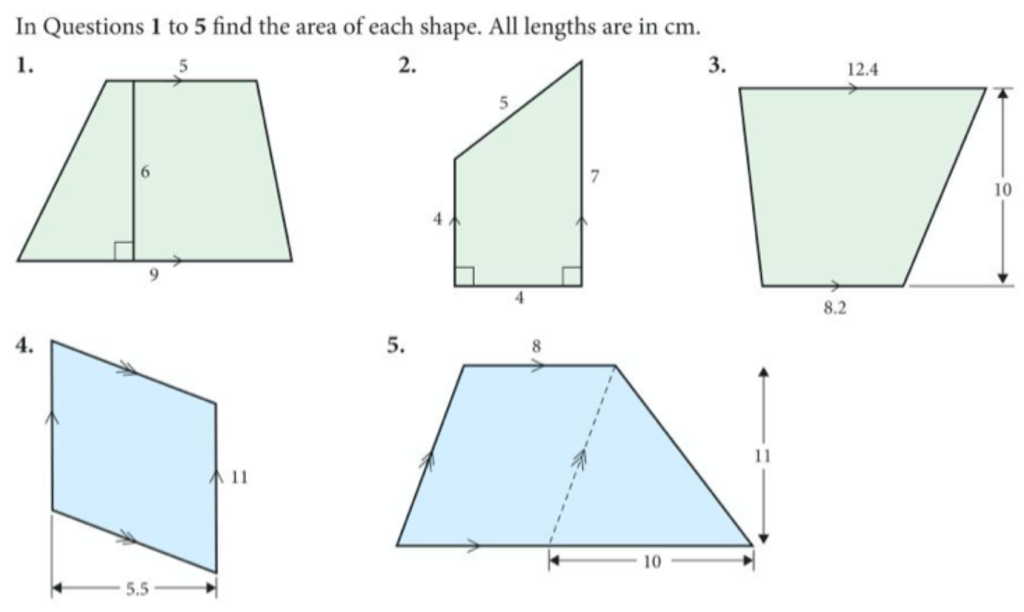 We should also be able to calculate the areas of trapezia and parallelograms. We can either do this by memorising a formula or by using common sense (or ideally using both).