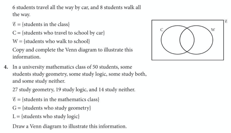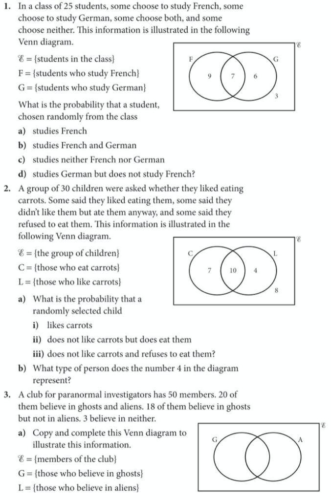 We already encountered Venn Diagrams when we looked at set theory. Let’s practice counting the number of elements within Venn Diagrams (counting is an important skill in probability, as we often want to count the number of favourable outcomes and the total number of outcomes, to use our simple probability formula.
