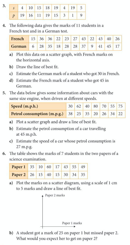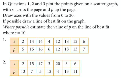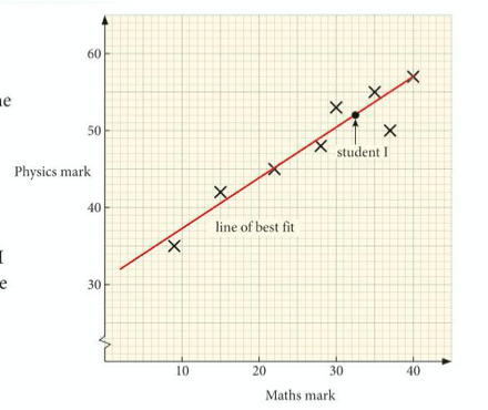 If a graph shows positive or negative correlation, it can be useful to draw a line of best fit, which indicates the general relationship between the two variables and helps us to predict what one of the variables will be if we know the other one. The line should have an equal number of the points on either side of it (it is easier to draw with a transparent ruler).