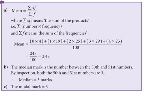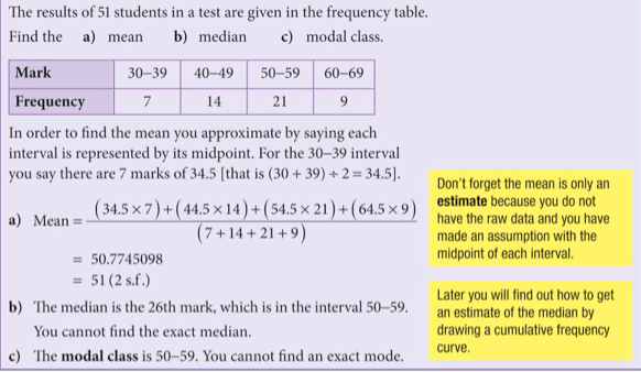 If the data has been grouped, we can still calculate the mean average, and we still use the formula mean = Σfx / Σf , only this time, x means the midpoint of the group, e.g. if the group is 20-25, x will be 22.5. Below is an example to show how we calculate averages from grouped data: