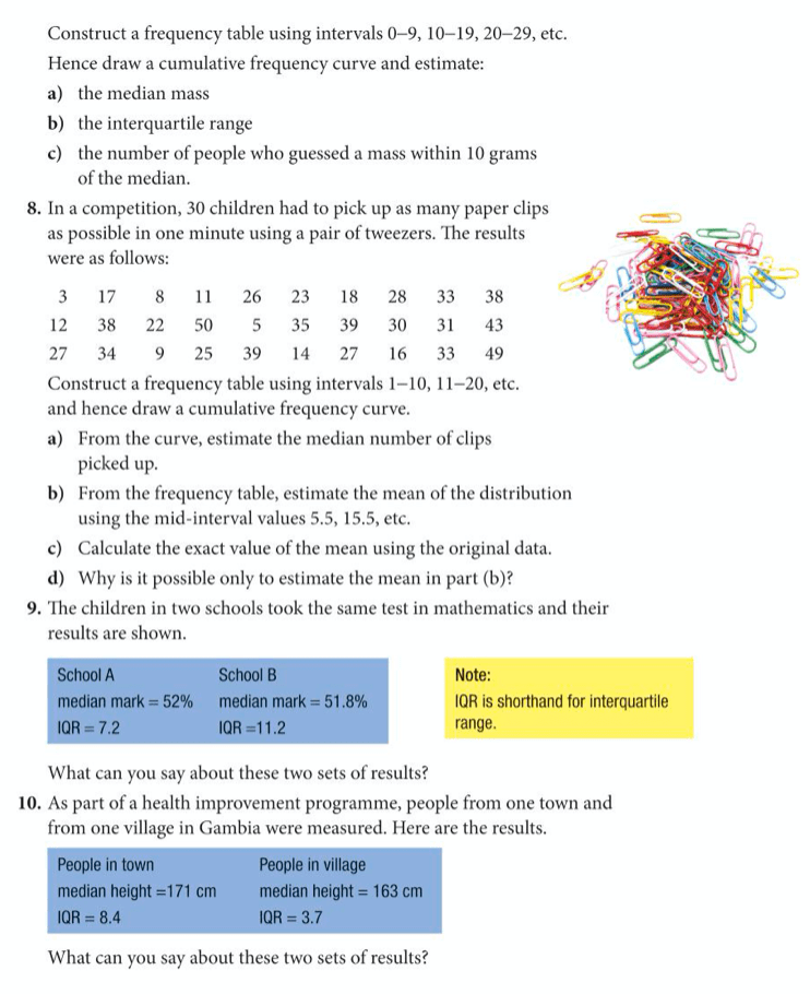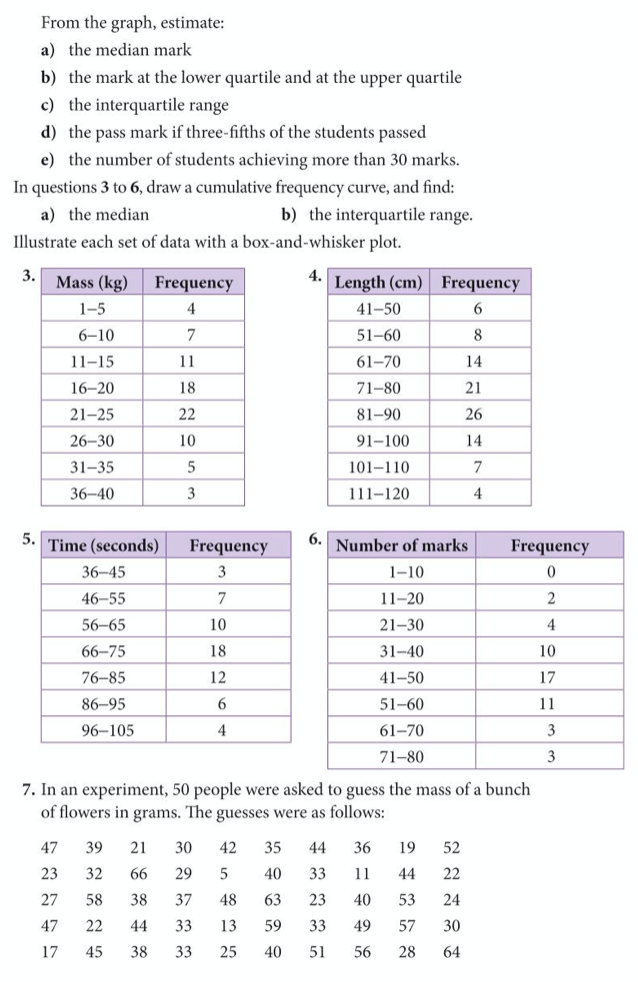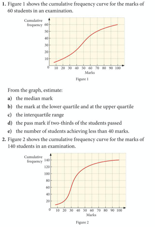 - Plot a cumulative frequency curve and use it to estimate the median and the interquartile range.