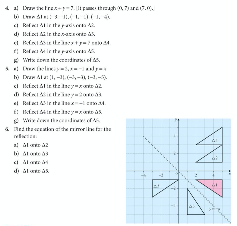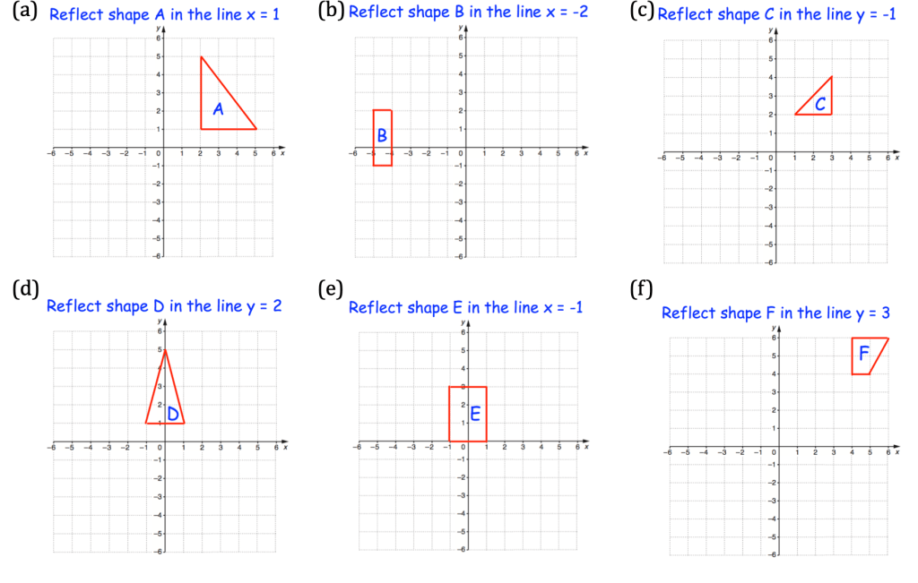 Once we know the line of reflection, the process for applying it to a shape is to take each point of the shape and repeat it at an equal distance to the other side of the line of reflection. Let’s try some