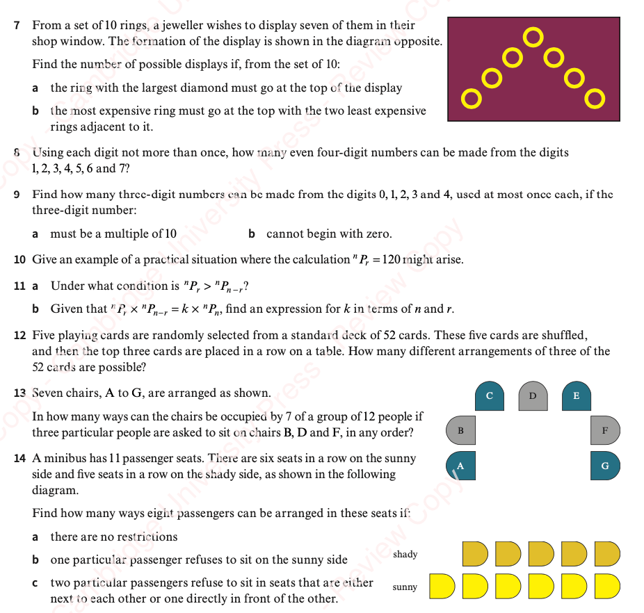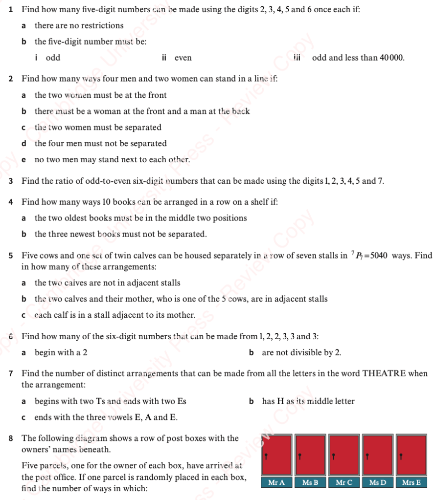Restrictions will reduce the total number of arrangements possible. Problems are typically tackled by considering the restricted positions first and then the ones without restrictions.