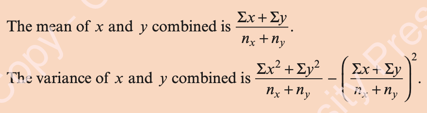 You can use the formulae shown below, but again, in practice we solve problems by multiplying up to give the ∑x and ∑x2 values that we require to use with the combined dataset.