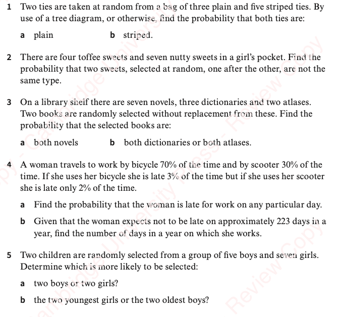 A boy walks to school (W.) 60% of the time and cycles (C) 40% of the time. He is late to school (L), on 5% of the occasions that he walks, and he is late on 2% of the occasions that he cycles.