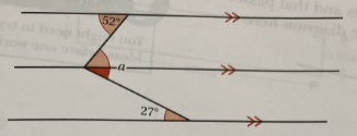 By adding an additional parallel line passing through a (as shown below), we can then spot alternate angles and sum these to solve the problem: