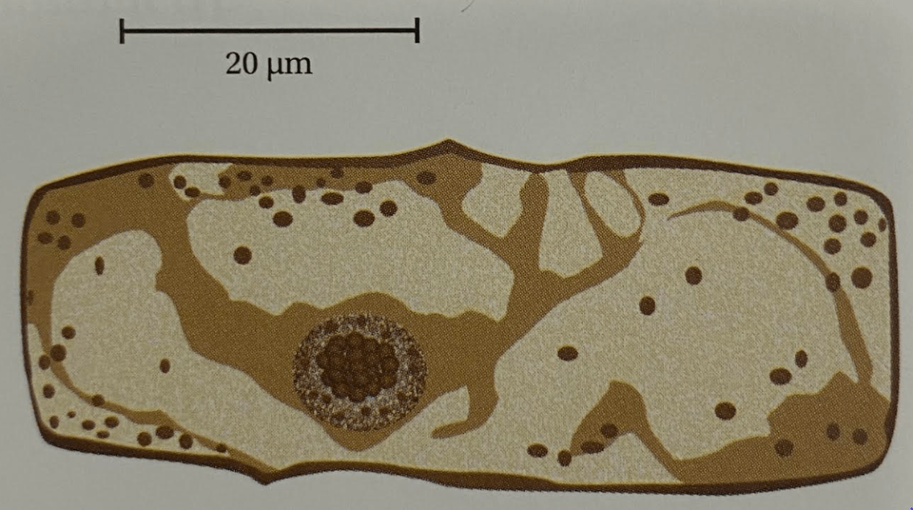 The following diagram shows a magnified cell. Four students have calculated the actual length of the longest side of the cell, but some of them have got the wrong answer. Which of the answers is correct? (a) 5.6µm, (b) 56µm, (c)560µm, (d) 5600µm