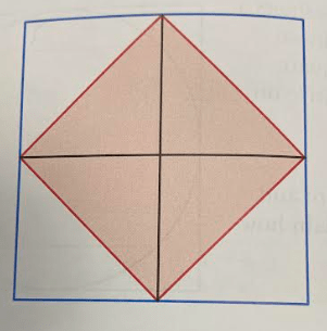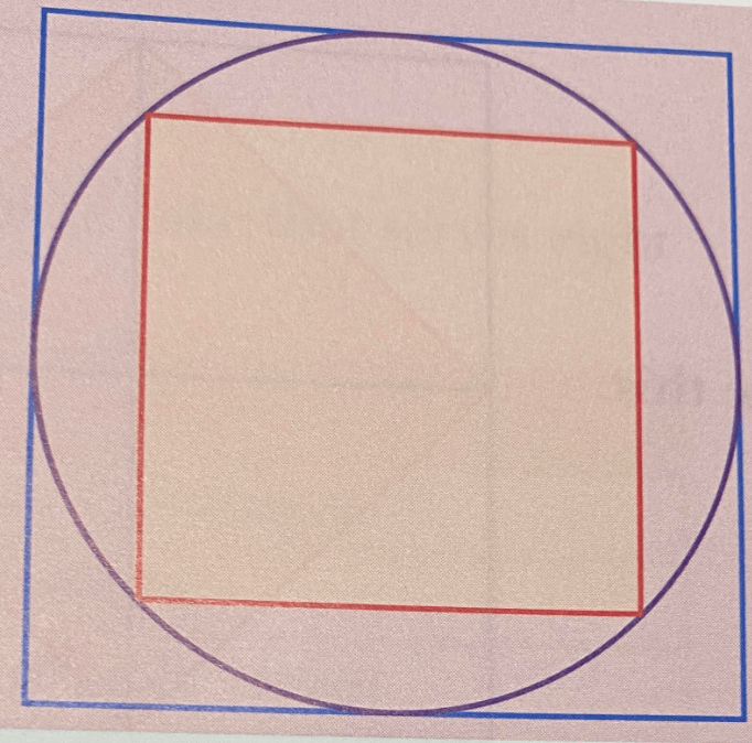 Below is a diagram of a red square with a purple circle drawn through its vertices and a blue square that touches the purple circle on all sides.