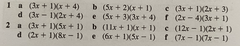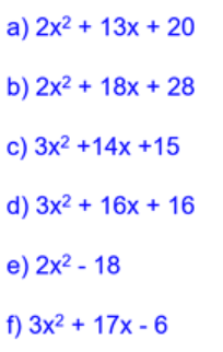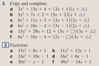 In the slightly more difficult situation where the x2 term has a coefficient, we need to find two numbers whose product is equal to the product of the coefficient of x2 and the constant. Once we have found these two numbers, we use them to split the “x-term” up into two parts and we can then factorise by first factorising the first two terms and the second two terms separately.