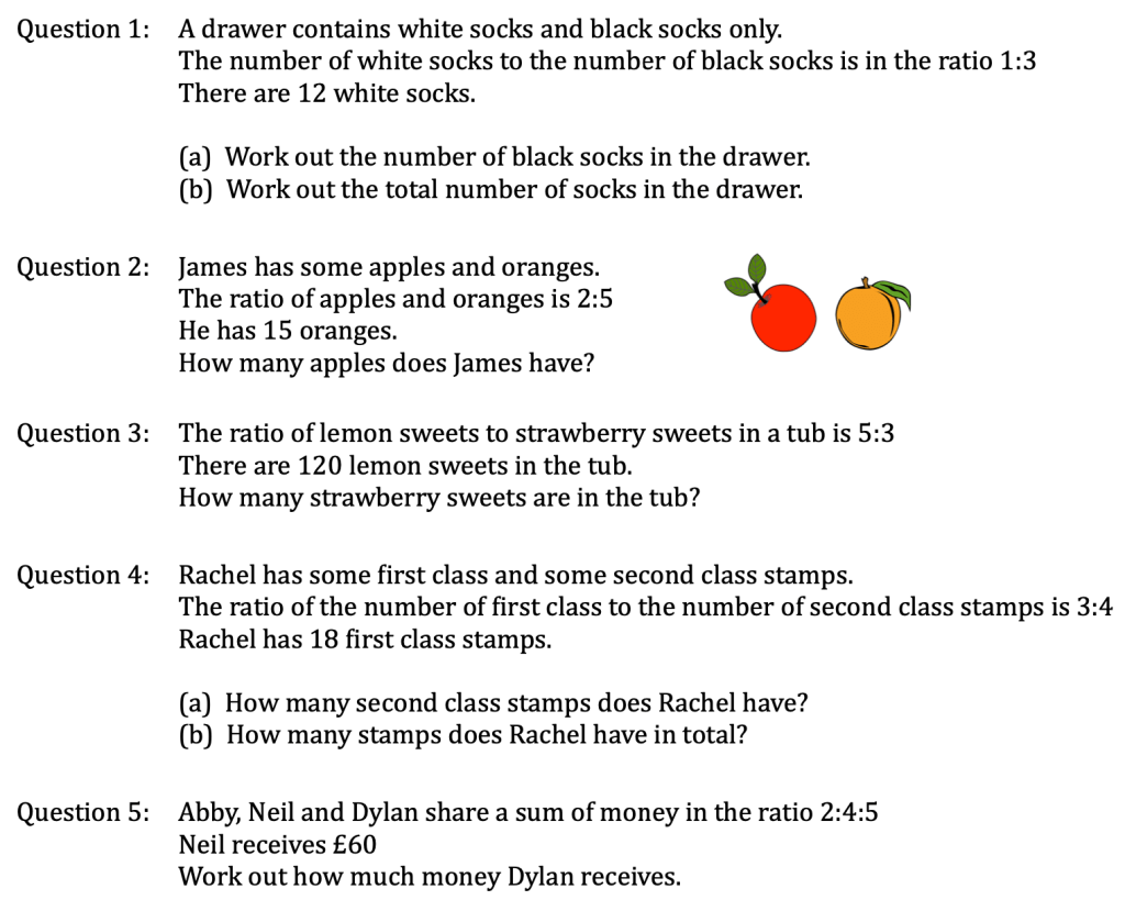 Similarly to the previous problems, we divide Bob’s $150, but not by the total, only by Bob’s “ratio number”, i.e. $150 ÷ 3. This gives us the value of 1 part, i.e. $50. So Ann receives 2 x $50 = $100.