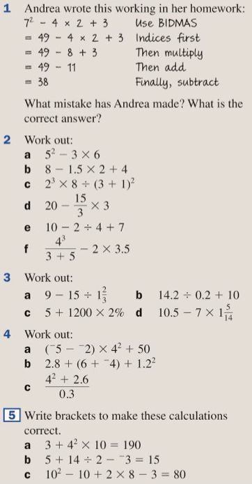 When doing a calculation we don’t just work from the left to the right. Instead, we start with whichever calculation is higher up in the order of operations and do that calculation before any other ones. As always in mathematics, this is best seen through examples.