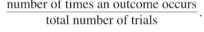 When we talk about a theoretical probability that a coin will land on tails of 1/2, what we really mean is that if we tossed the coin many many times, over time the proportion of times it would land on tails would be about 1/2 of the total number of times we tossed it. This is the idea of relative frequency, defined as: