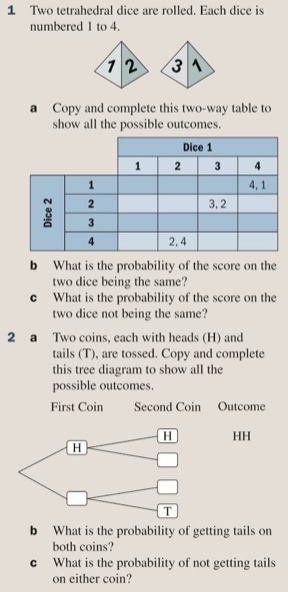 If we consider the outcomes of two different trials (e.g. tossing a coin and rolling a dice), a sample space diagram is very useful to list the sample space (that is all possible outcomes). Let’s try drawing one of these. We could also use a tree diagram (let’s try this too).
