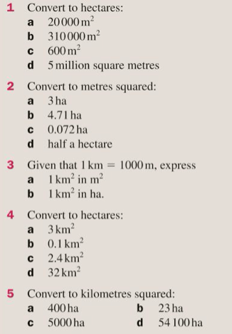 We should also be aware of a unit called hectare, which is equal to 10,000m2. To convert from metres to hectares, we divide by 10,000 and to convert from kilometres to hectares, we multiply by 100.