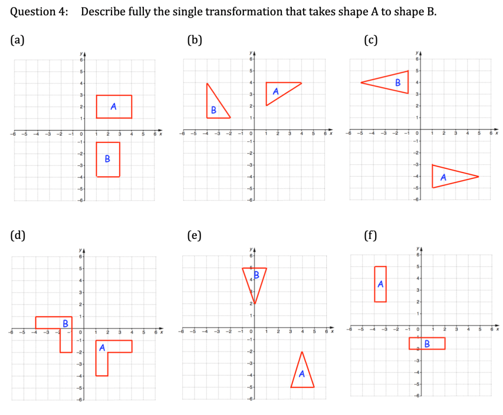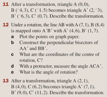 We need to be able to recognise what transformation has taken place when we are shown an object and an image. This means finding not just, for example, that a rotation has taken place, but also finding the centre of rotation, the magnitude of the rotation and the direction of the rotation.