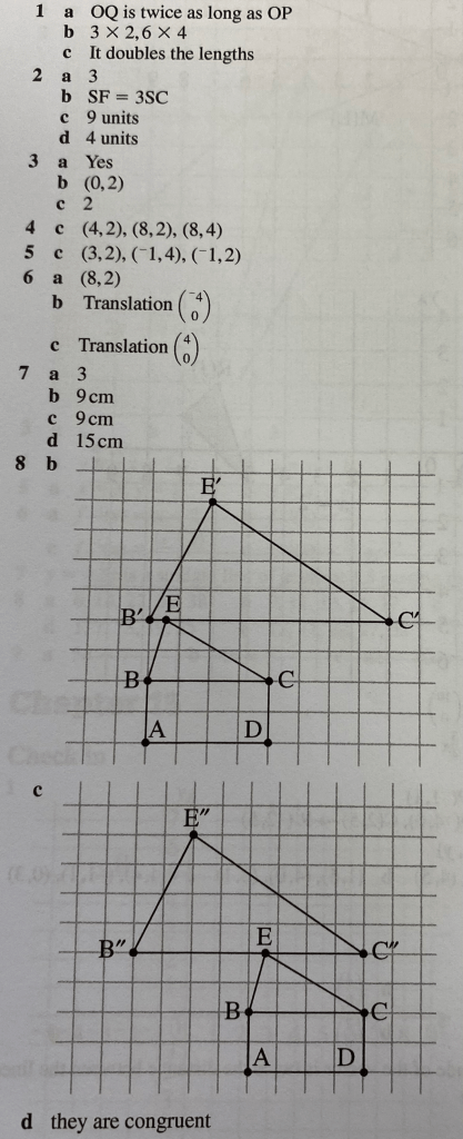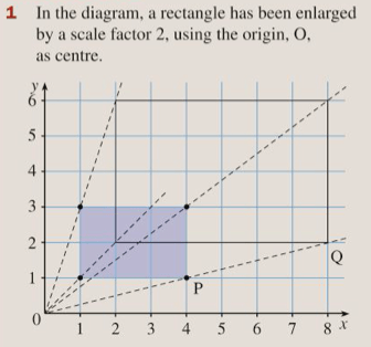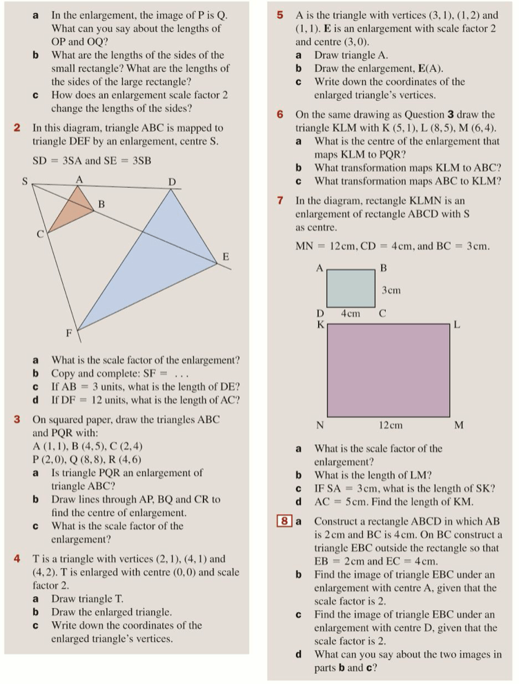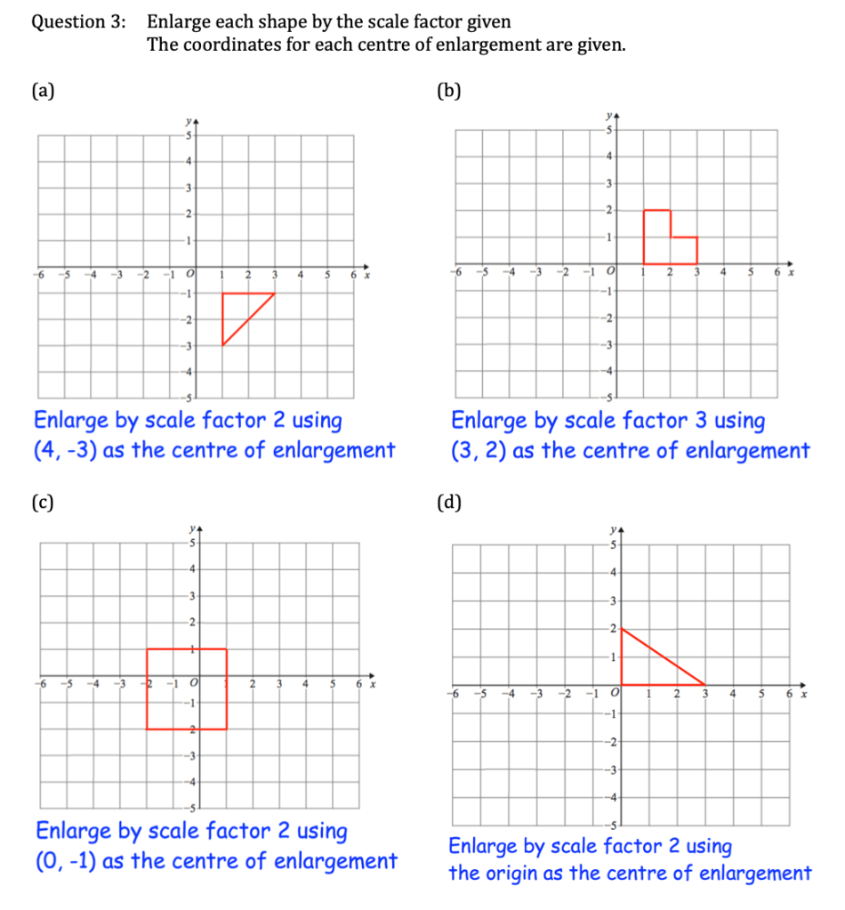 For instance, for an enlargement of scale factor 2, all points on the shape are moved to points twice as far from the centre of enlargement as the original points. What do you think would happen for an enlargement of scale factor 1/2? What about for an enlargement of scale factor -1/2? Notice that enlargements don’t always make shapes larger.