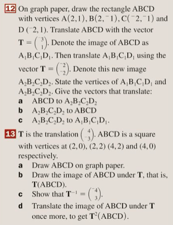 12. On graph paper, draw the rectangle ABCD with vertices A(2,1), B(2,-1), C(-2,-1) and D(-2,1). Translate ABCD with the vector . Denote the image of ABCD as A1B1C1D1. Then translate A1B1C1D1 using the vector