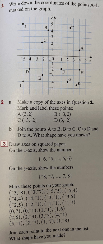 What we saw above is actually only part of the coordinate axes. We can extend them to the left and down in order to deal with negative coordinates. Let’s try plotting some coordinates where either the x-coordinate or the y-coordinate or both are negative.