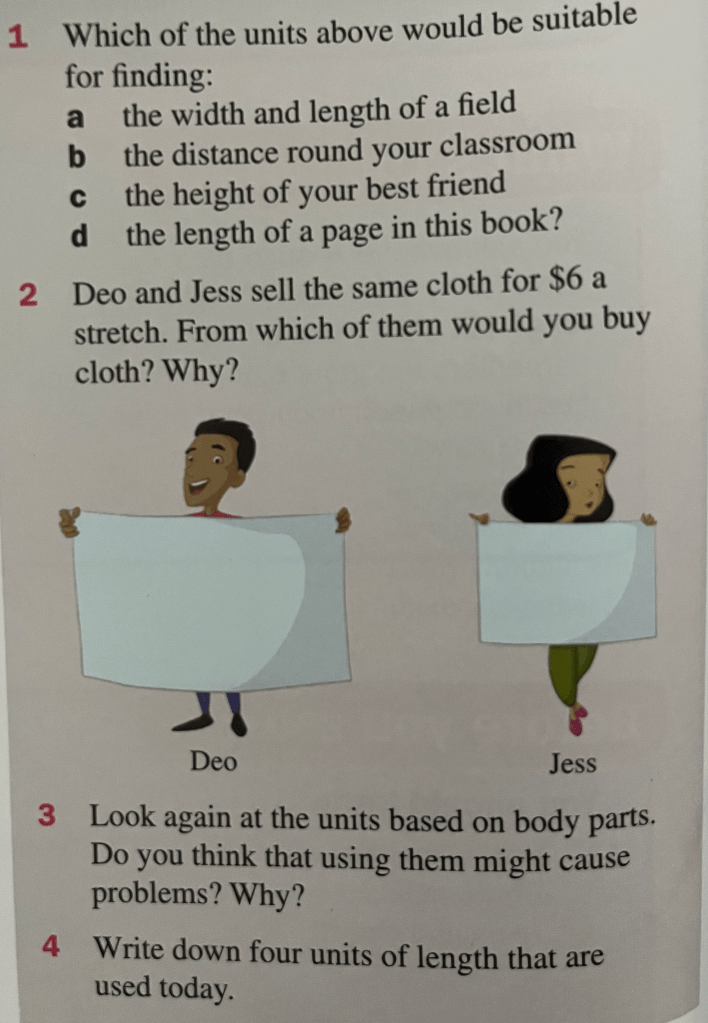 The standard unit for length in the SI system is the metre. One metre is about the length of one stride. Ask the teacher to use the metre rule in the class to measure some objects in the class. Se if you can guess the length before he measures them.