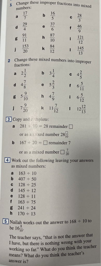 To convert from an improper fraction to a mixed number, we divide the numerator by the denominator. This gives us the whole number part and the remainder gives us the numerator of the fractional part.