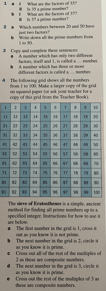 A prime number is one of the most important types of number in mathematics. It is a number with exactly two factors. One example is 13, because its only factors are 1 and 13. Which other examples can you think of.