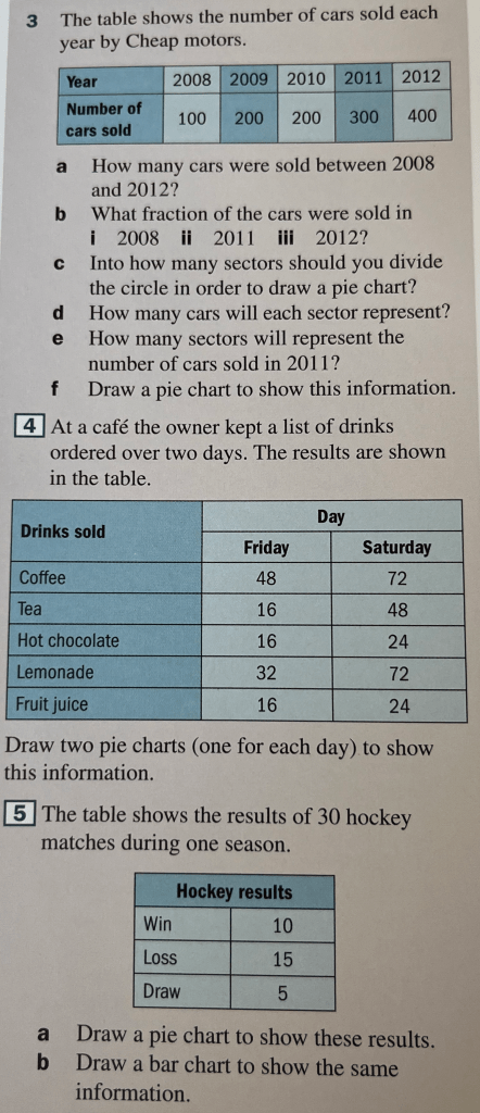 To draw a pie chart, we first need to calculate what angle is needed in each of the different categories’ sectors.