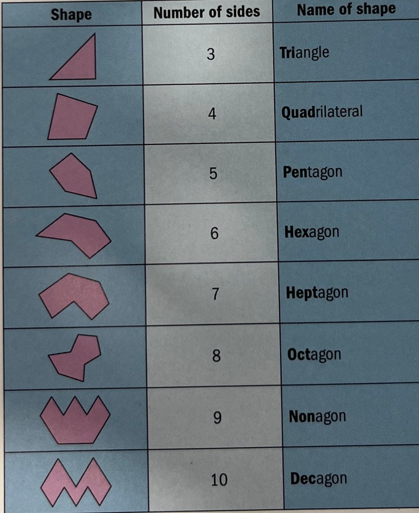 Any closed 2 dimensional shape is called a polygon. Below are the names of the first 8 kinds of polygon: