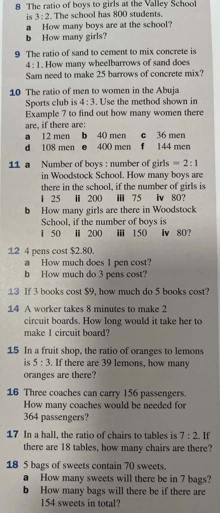 So the questions work a bit differently, although they still use ratios showing how things are shared between two or more people or things.